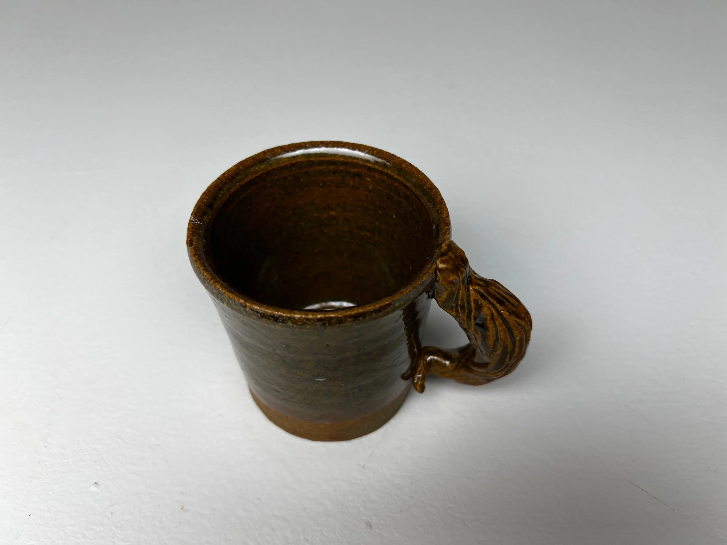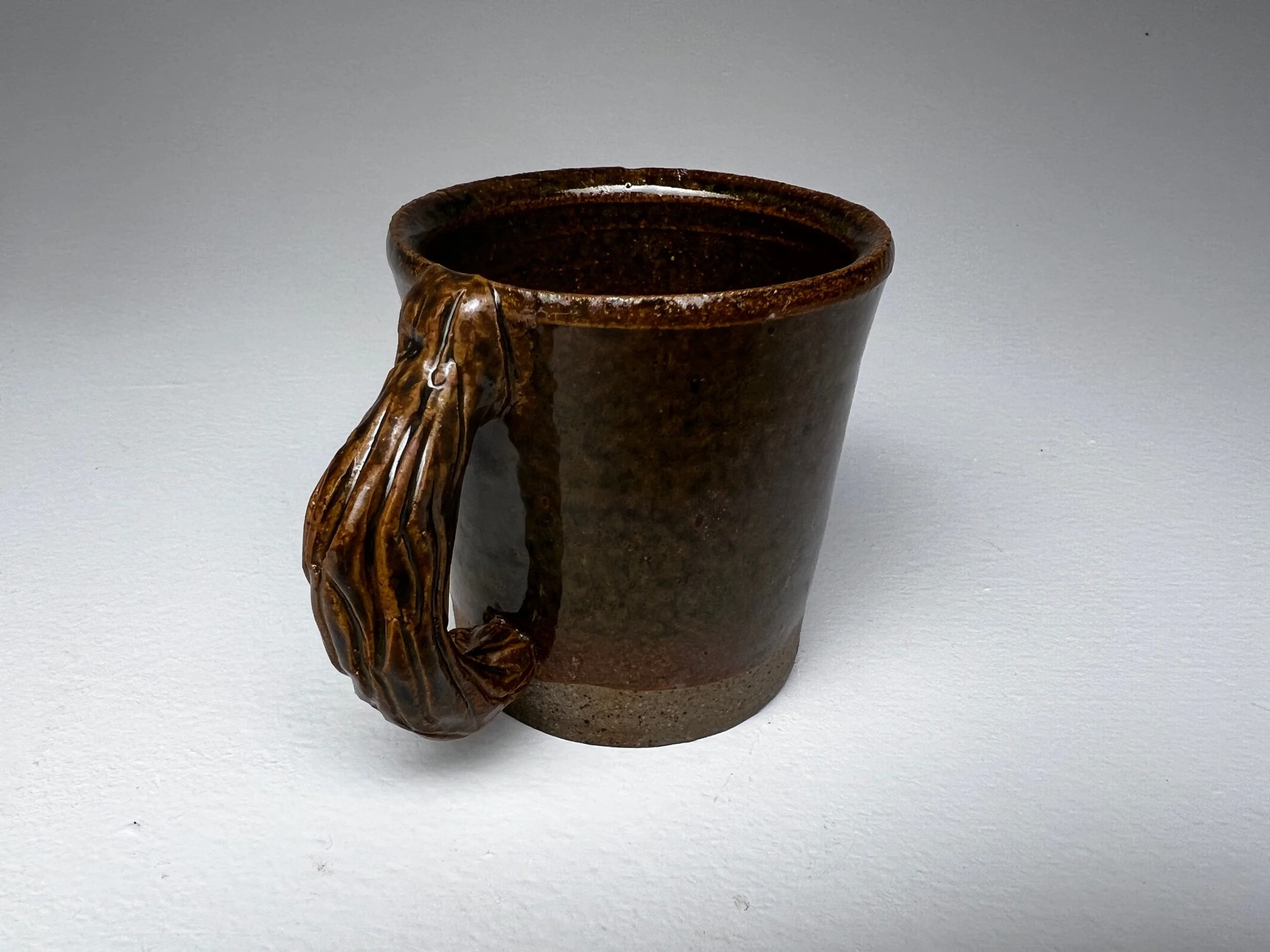 Glazed in deep earthy tones with warm accents in iron oxide, the mug feels grounded in the hand: rustic, tactile, and full of character. Every curve, carve, and brush of glaze was shaped by hand, giving each mug its own natural variation.